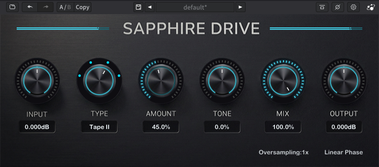 六个参数,四种饱和类型。Sapphire Drive旨在不打扰你的工作流——将它加载到通道上,根据所选类型,它会立即为声音增加温暖感、存在感或厚度。无需反复调整,就是好用。