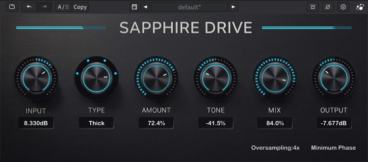 Sapphire Drive是一款听感通透的饱和效果器,在加载的瞬间就能为你带来“对了”的声音。将其挂在任意轨道上——挑选一种饱和类型,设置好染色强度,即可感受声音的丰富。